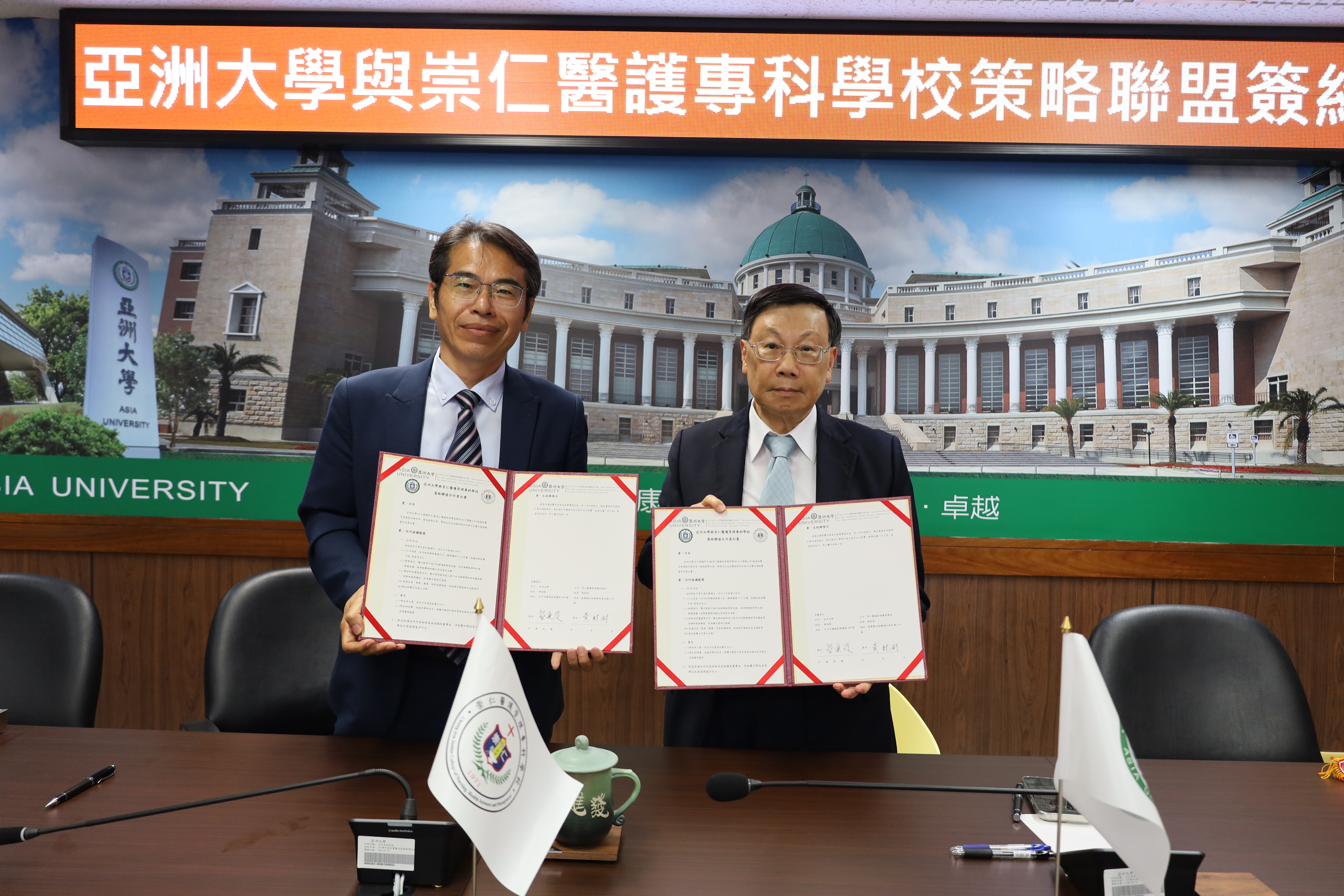亞洲大學、崇仁醫護管理專科學校合作,推動「5+2護理照護人才培育」計畫,18日上午由亞大校長蔡進發、崇仁醫專校長黃財尉代表簽署合作意向書,象徵兩校未來在五專銜接大學護理教育上,建立緊密的合作關係,推動崇仁學生五專畢業後,銜接亞大114學年新設立的二年制護理在職進修班,畢業後直接進入亞大附屬醫院就業,啟動就學、就業一條龍產學人才培育模式。